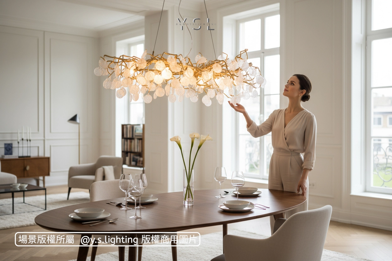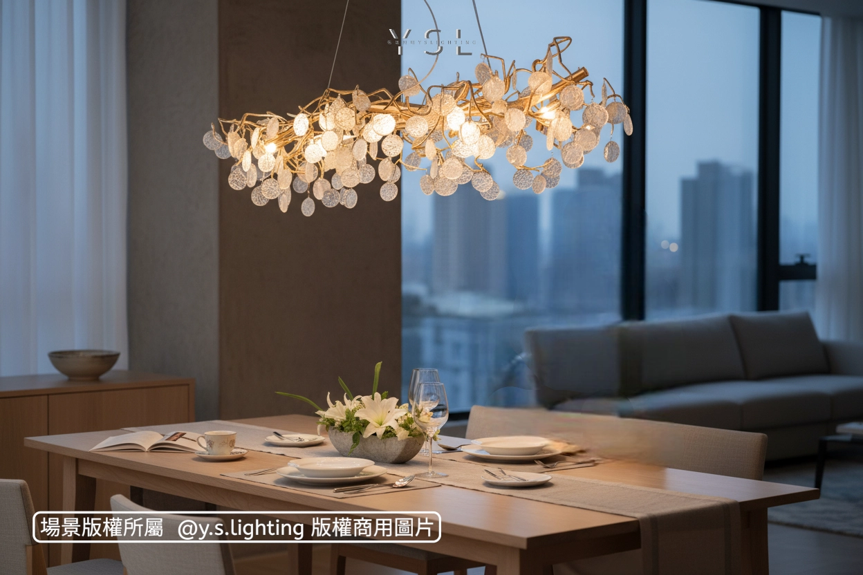 精緻的枝幹,錯落有致地托起片片手工玻璃,彷彿一座微型花園懸掛於空中打造出獨一無二的風格。燈光穿透玻璃片,在空間中灑下點點光影,營造出如夢似幻的浪漫氛圍。