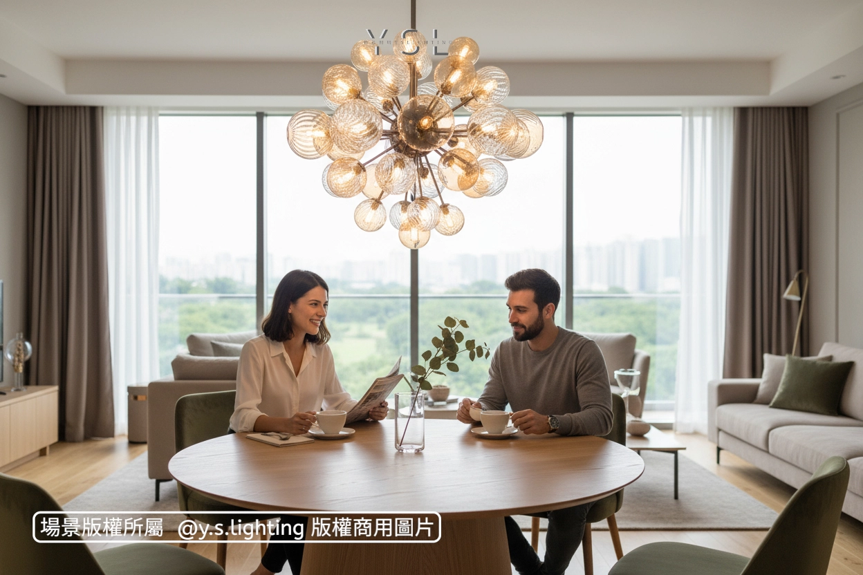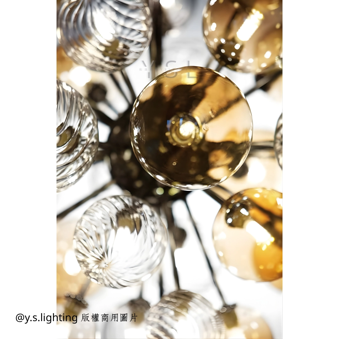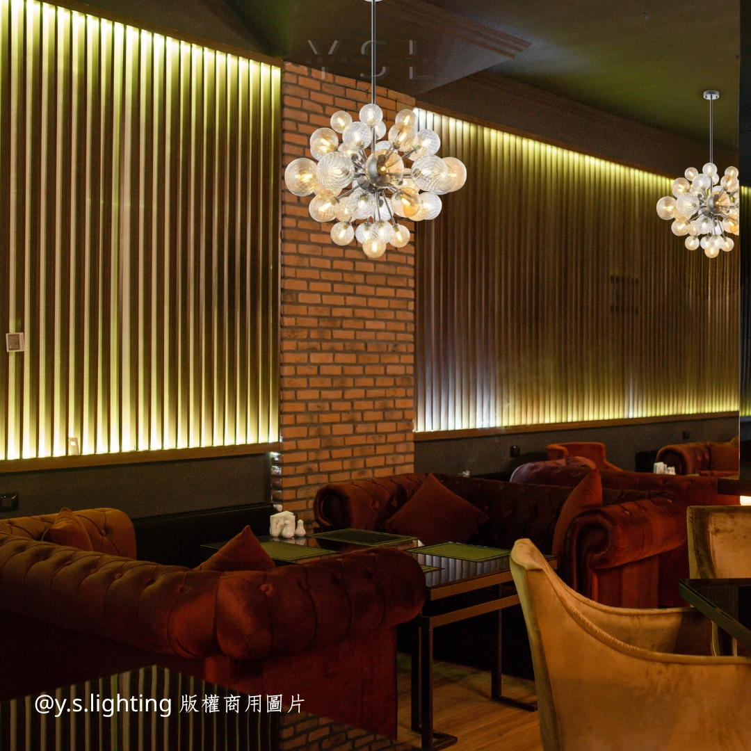 一顆顆果實在光影盛開,彷彿夜裡的派對在悄然開場,金屬的冷冽呼應玻璃的清澈,點燈後果實般的光球相互交織,綻放出歡愉與浪漫的韻味提升空間氛圍