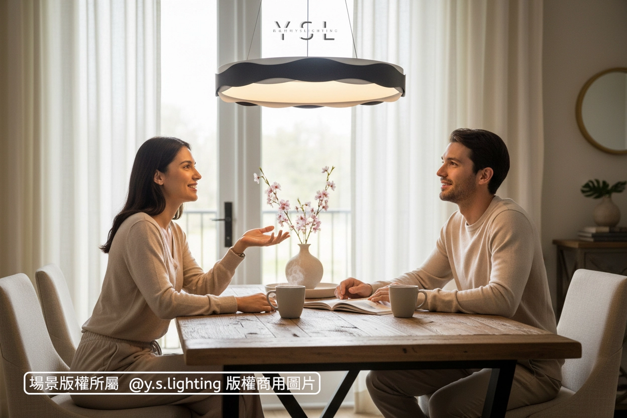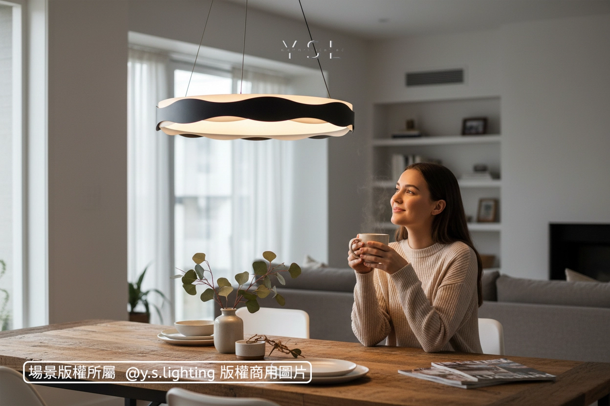 讓家蕩漾著溫柔的光波,嚮往在靜謐的空間中,光線如水波般輕柔流動,黑色波浪外圈,搭配乳白色內圈,光線穿梭其間,營造出豐富的光影層次,讓您的空間更具藝術感。