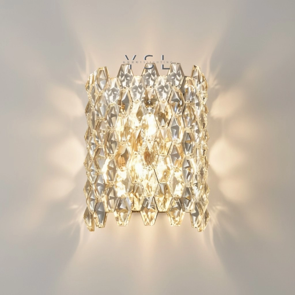 透晰水晶層層排列光輝以純淨折射,讓光影在牆面輕輕流動,細緻金屬在裏頭若隱若現,托起水晶的秩序形塑出低調奢雅的富豪氣息