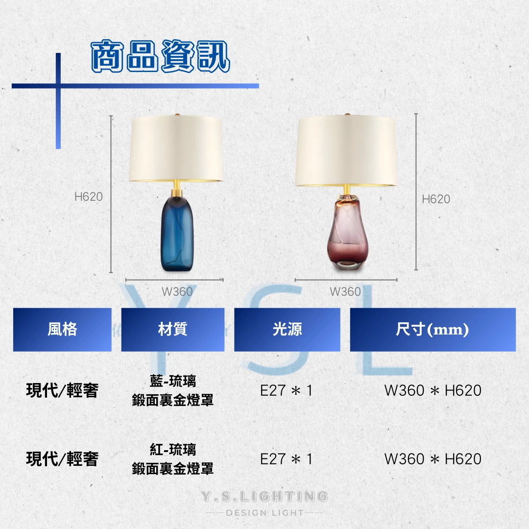 材質:琉璃藍色/紅色、緞面裹金燈罩