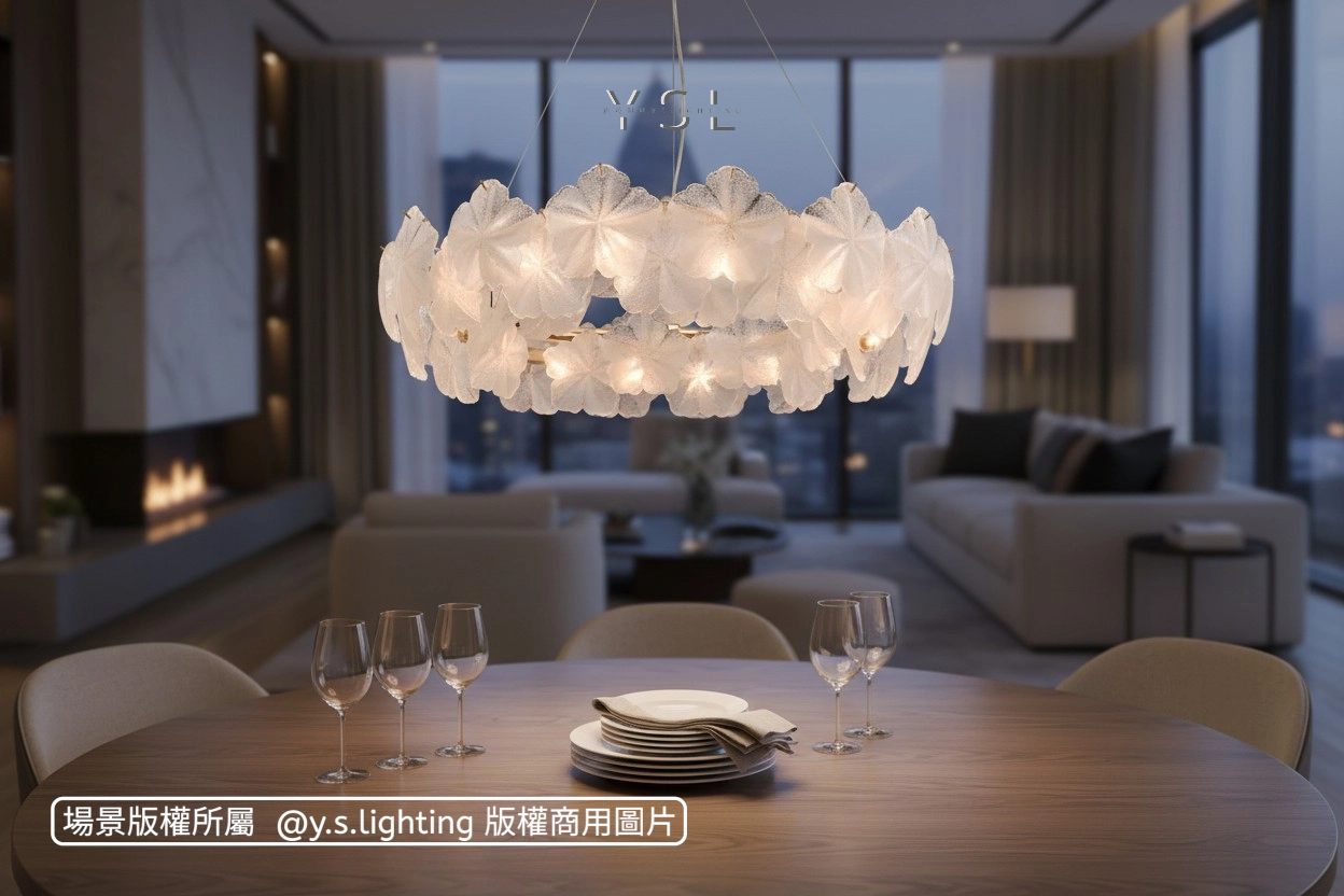 在空間中描繪一幅永恆的浪漫花園,一盞如花朵般盛開的燈飾映入眼簾,溫柔的光芒灑落在每一個角落,彷彿置身於祕密花園中感受花朵呢喃的細語。