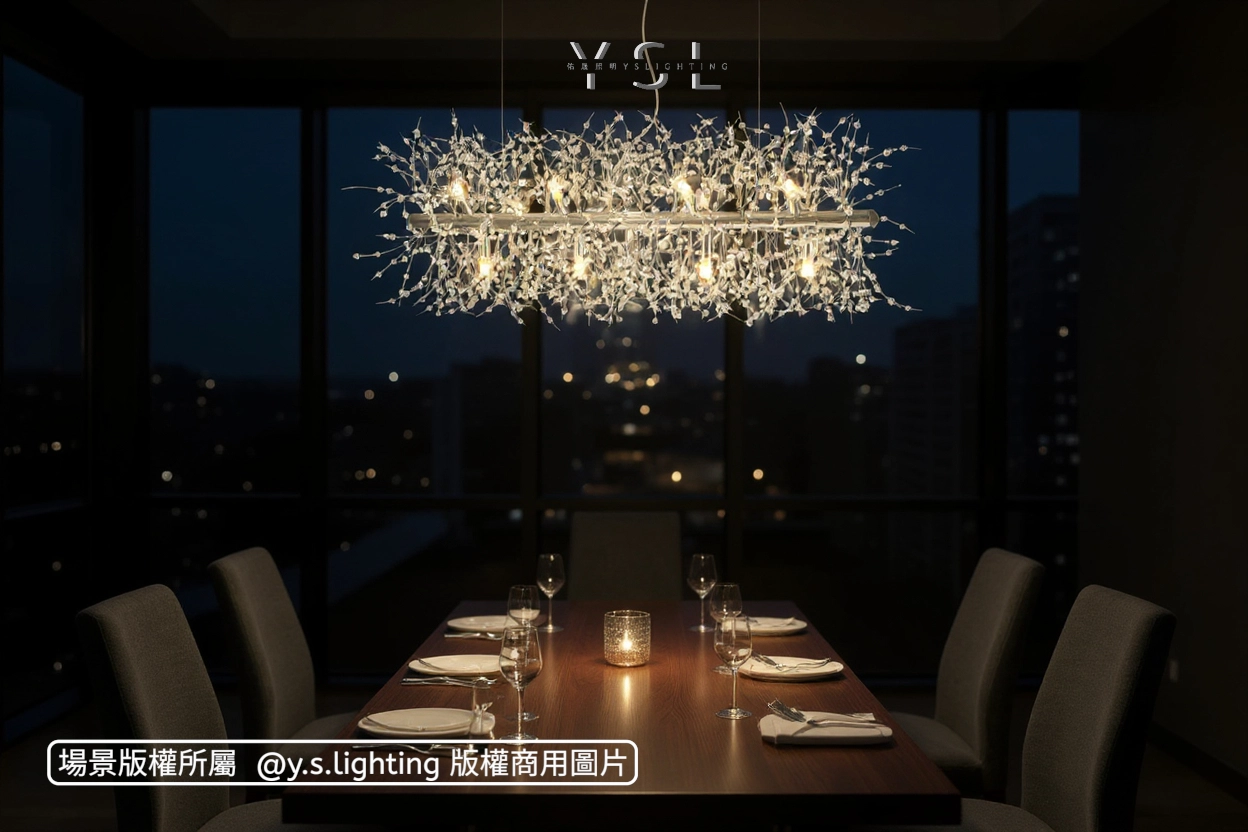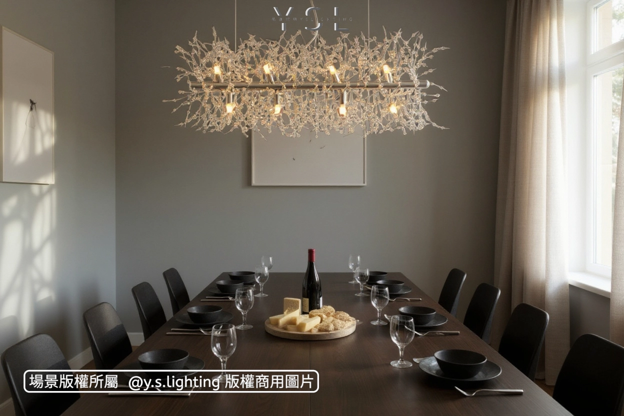 讓您的空間沐浴在星光點點之中。這款吊燈以其獨特的設計和精湛的工藝,為您的家帶來奢華與藝術的完美結合。無論是晚餐時分的溫馨光影,還是夜晚的靜謐氛圍,「星河粼光」都能營造出令人難忘的體驗。