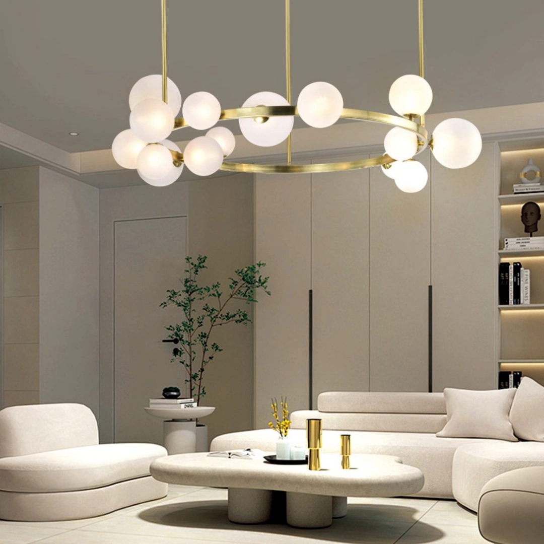 優雅的金色圓環,勾勒出簡約現代的線條,輕鬆融入各種居家風格。乳白色球體燈罩,散發出均勻柔和的光線,營造舒適溫馨的氛圍。為您的空間注入一絲溫暖與詩意,讓每一次擡頭,都彷彿與星空對話。
