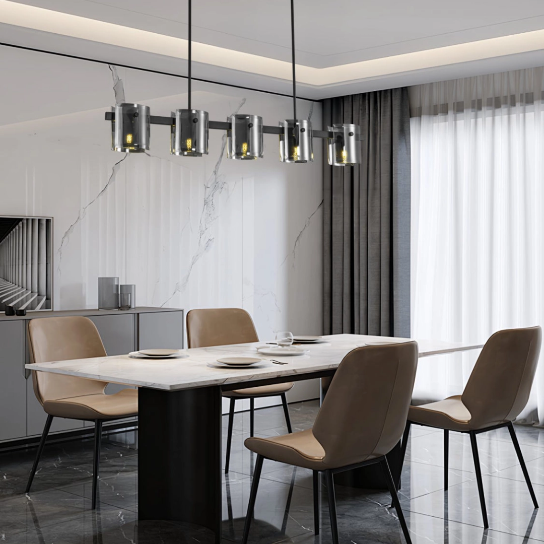 簡潔的黑色金屬框架搭配圓柱形煙灰色玻璃燈罩,散發現代工業風的魅力。體驗光影交織的詩意生活。此款吊燈以其獨特的美學設計和精湛的工藝,為您的餐廳、客廳或任何渴望溫暖光芒的角落,注入一絲低調的奢華和迷人的藝術氣息。