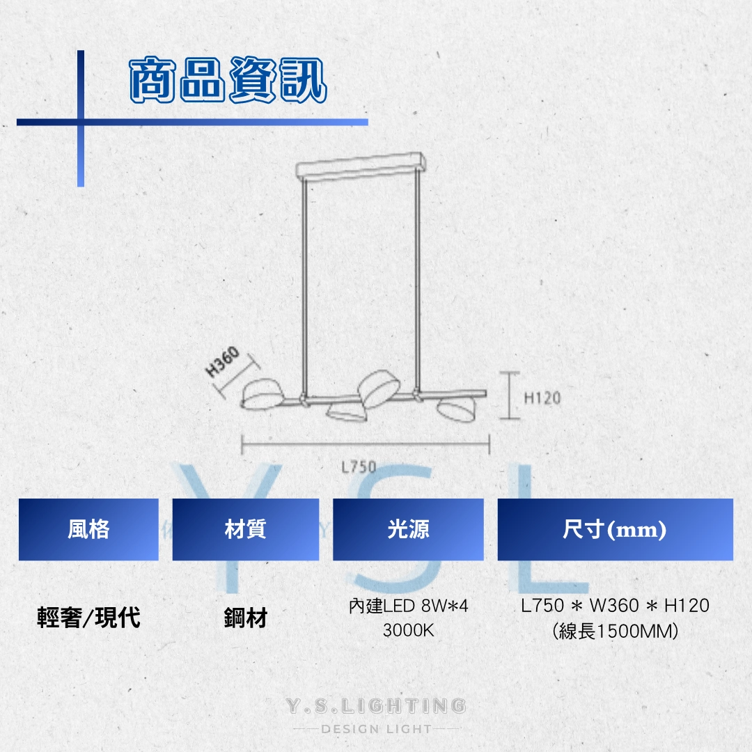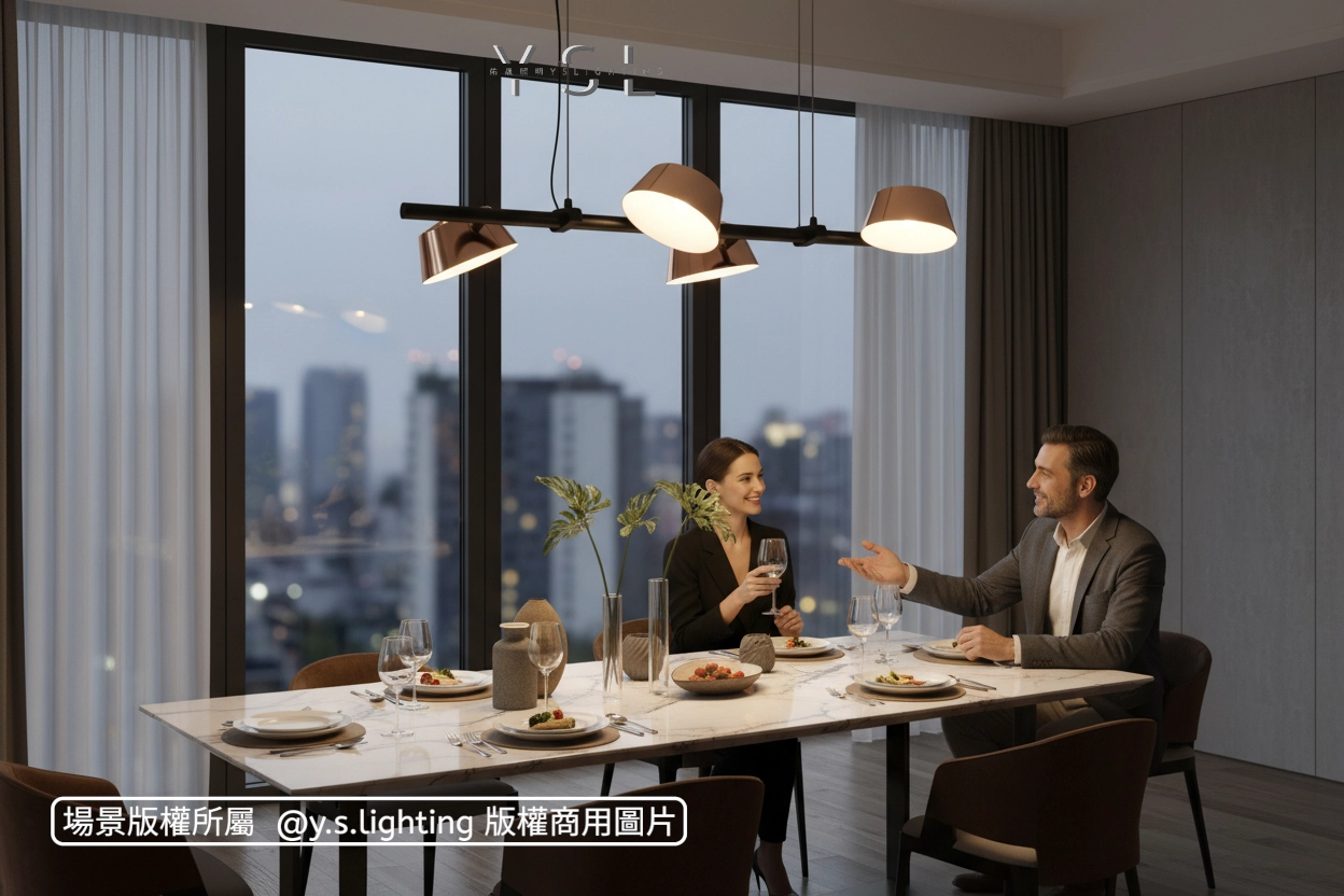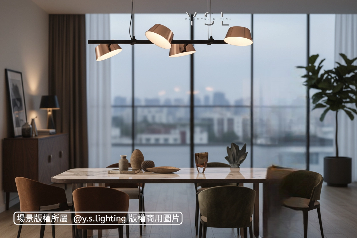 四個獨立的燈頭,角度可自由調節,可以不對稱的傾斜角度,營造出活潑生動的光影效果,讓空間更富層次感。讓每一次的相聚,都沐浴在溫暖的光影中。以其獨特的設計語彙,為您的餐桌注入一抹藝術氣息。夕陽餘暉灑落在精緻的餐具上,家人朋友圍坐,談笑風生,光影在彼此的臉龐上跳躍,溫馨而美好。