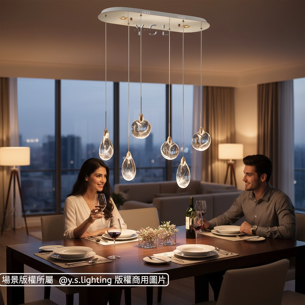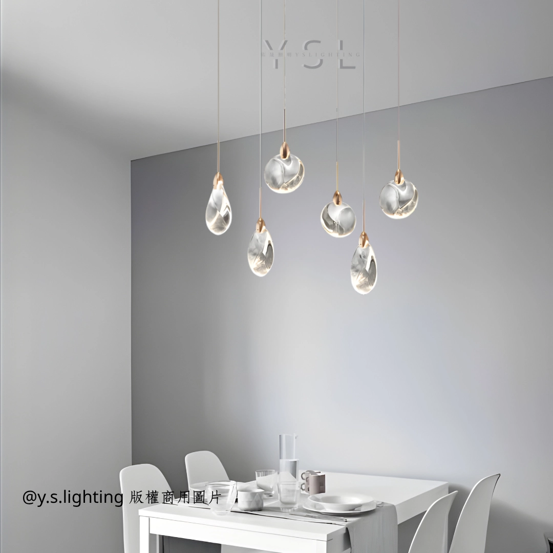 水晶材質,光線穿透性強,營造明亮柔和的晶彩光照效果。此款吊燈設計靈感源自清晨晶瑩的露珠,每一顆燈泡皆如飽滿的露珠,在光線的照耀下,散發著柔和而迷人的光芒。